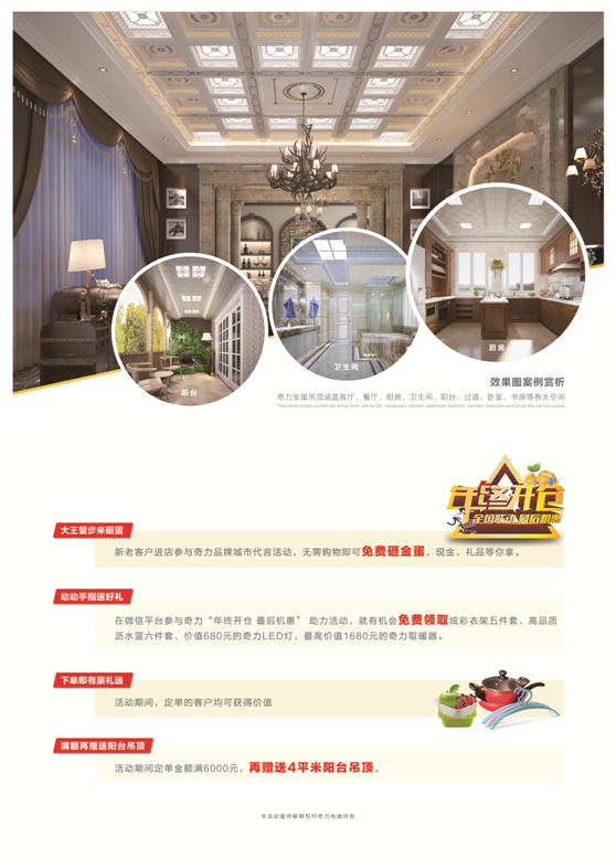 本次活動內容豐富,新老客戶進店參與奇力品牌城市代言活動,無需購物即可免費砸金蛋,現金、禮品等你拿。活動期間,定單的客戶均可獲得精美禮品一份,驚喜不斷,活動連連,更多的內容煩請進店咨詢,走過路過奇力吊頂專賣店,一定不要錯過。